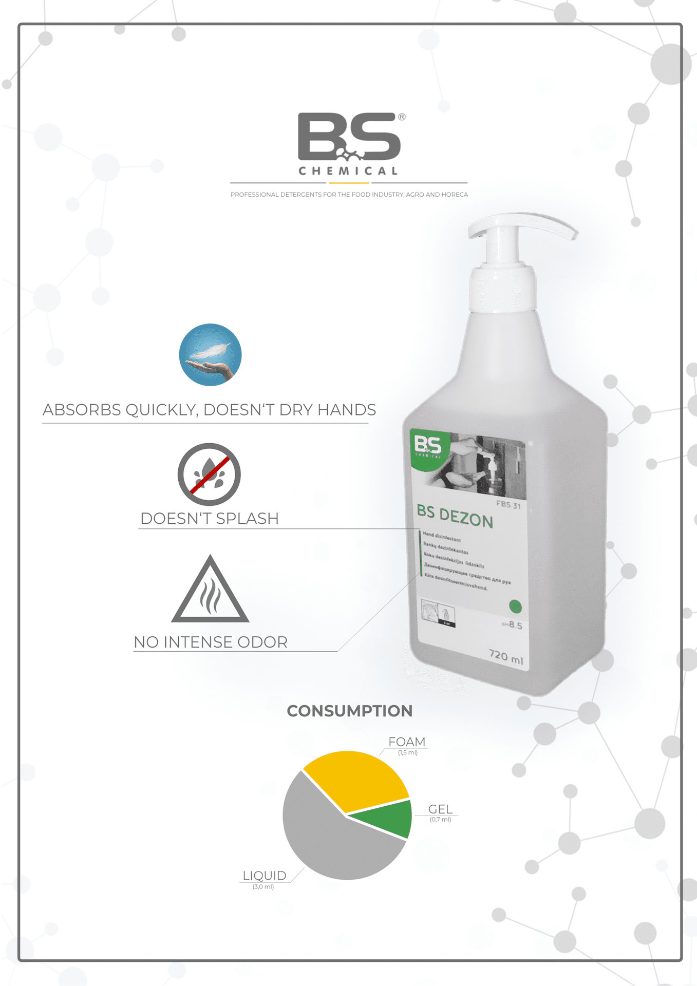 Mūsų produktai yra 80 % etanolio sudėties. Siūlome įvairias pakuotės parinktis (400 ml, 500 ml, 720 ml, 5 l, IBC). Galime valdyti didelius užsakymus ir kiekius. Siūlome privačios etiketės paslaugas. Dezinfekciniai produktai padeda kovoti su COVID-19.